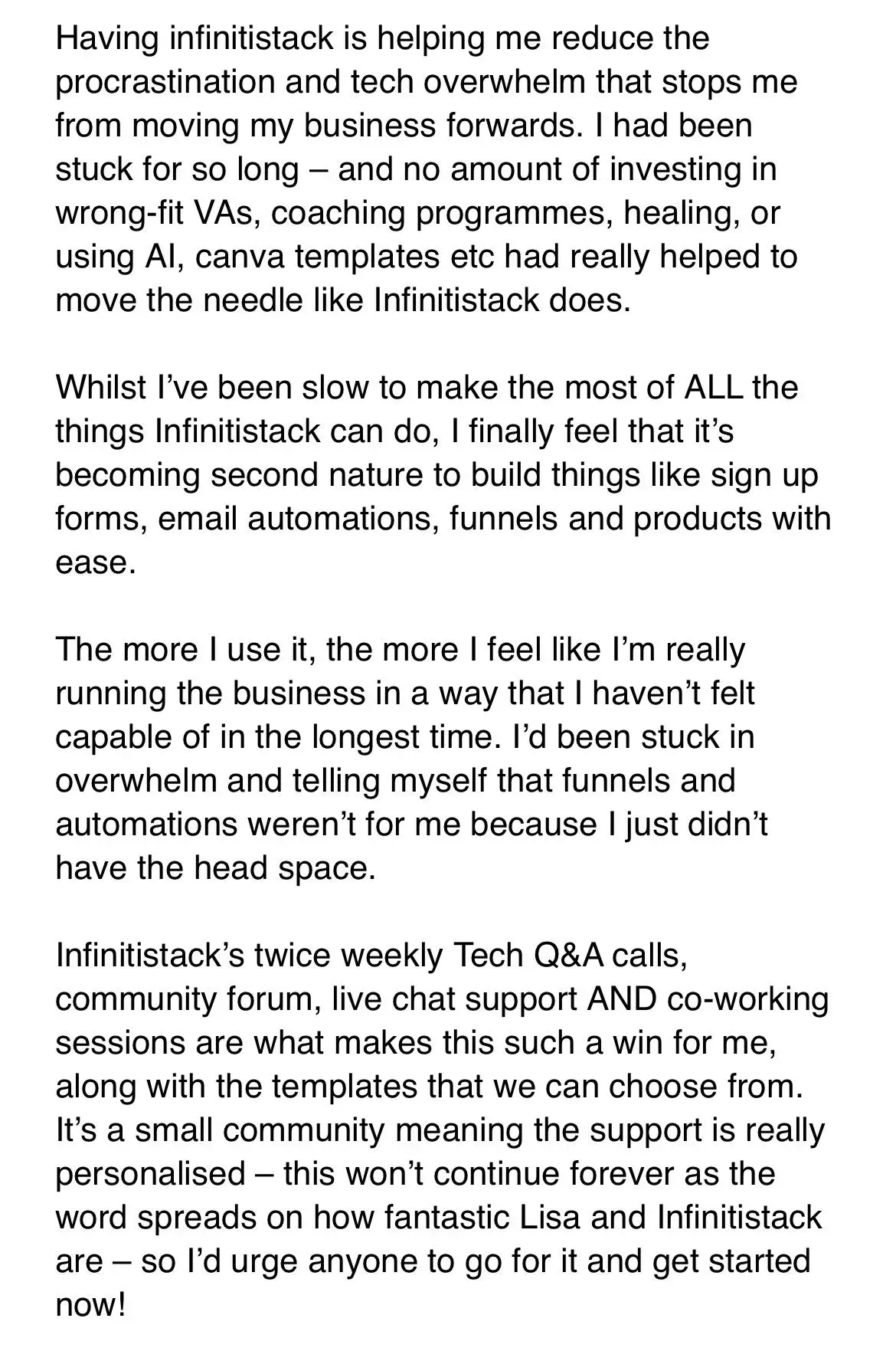 "As a coach and self-described ‘tech average’ solopreneur, Infiniti Stack has been a total game-changer. I now manage my whole business: from courses and email to calendars and client systems, all in one place. It's simplified everything and saved me so much money. What really sets it apart, though, is the support. The co-working sessions with Lisa have been a lifesaver, helping me feel confident and get things done without overwhelm. I used to juggle five or six tools just to keep things running, now I just log in to Infiniti Stack. It’s honestly been the best decision I’ve made for my business."